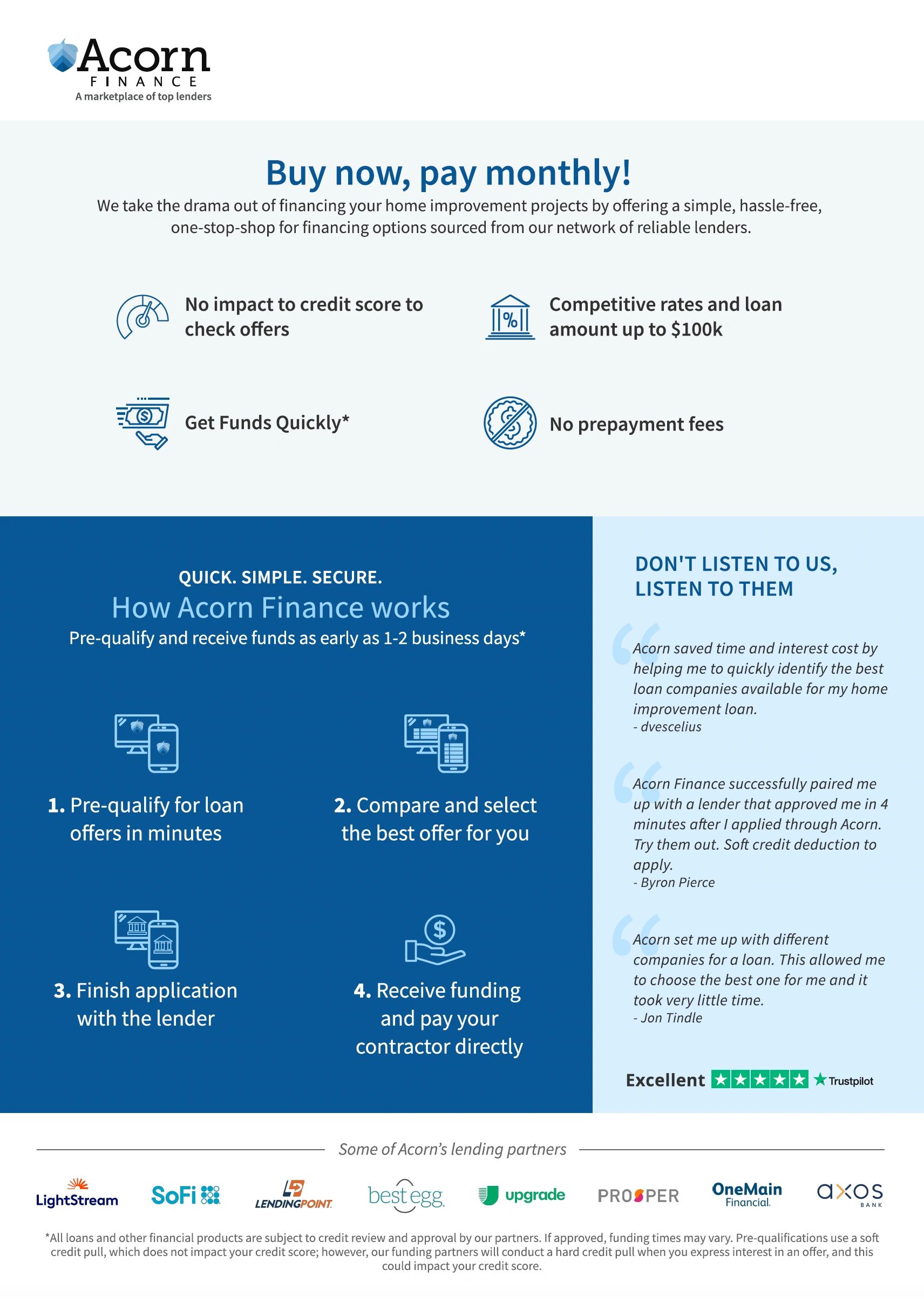 We’ve partnered with Acorn Finance to make financing your home improvement project fast, easy, and secure. With a simple online application, you can explore competitive rates and flexible terms from trusted lenders—all without impacting your credit score. Get approved quickly and receive funding ASAP.
